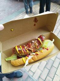ハーブの聞いた極太ソーセージをパンに挟んだ美味しいホットドックのお店です