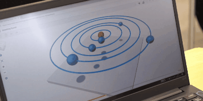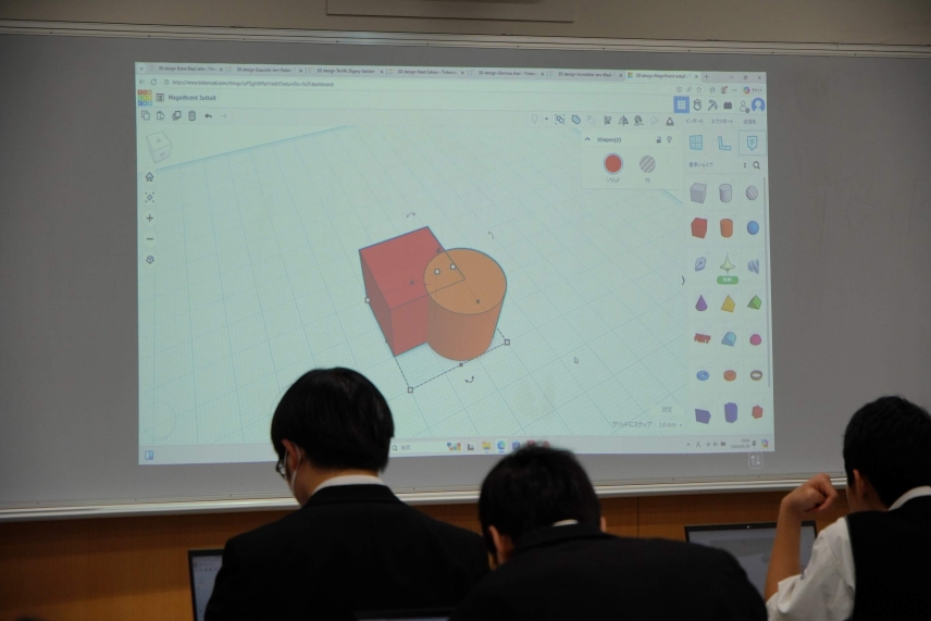 前半は、図形の結合や整列といった複雑なモデリング技術を習得。後半は、作成したモデルに重力や材質(木・プラスチック等)を設定し、実際に動かすシミュレーションを行いました。 特に、回転軸を使ってパーツを連結し、動く仕組みを作る実習は生徒たちに大好評でした。